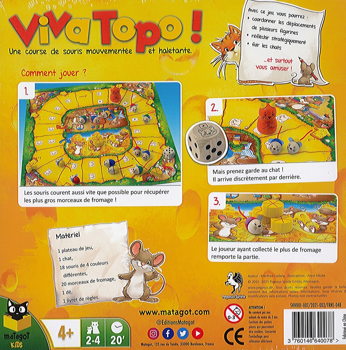 Viva Topo ! est un jeu de plateau et de course accessible dès 4 ans. Incarnez des souris au Pays de Cocagne, un territoire rempli de délicieux fromages. Mais attention, un chat affamé est sur vos traces !