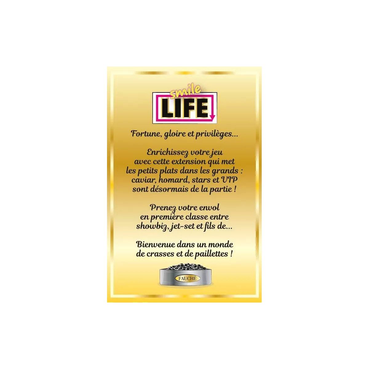 Smile Life : Vie de Luxe est une extension (nécessite le jeu de base Smile Life) pour 2 à 6 joueurs (dès 12 ans, 60 minutes). Elle enrichit le jeu d'ambiance et de collection avec un univers de luxe, de crasses et de paillettes (caviar, stars, jet-set). Cette extension est conçue pour être facilement mélangée au jeu de base et aux autres extensions, ajoutant de nouveaux métiers, malus et acquisitions.