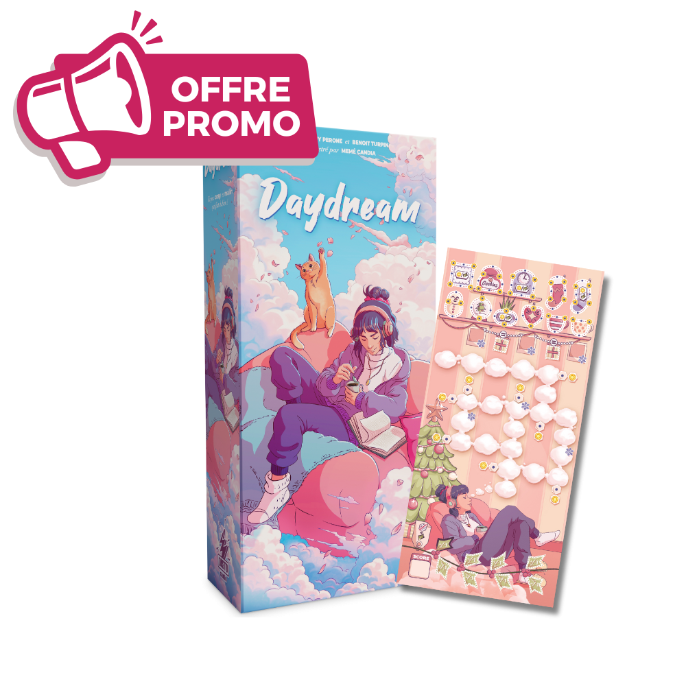 Faites une pause avec ce jeu cosy et malin ! Lancez les dés et remplissez votre grille afin que chaque ligne ne comporte que des chiffres différents. Pliez et dépliez votre plateau pour former de nouveaux décors et explorer ce jeu de détente. Installez-vous confortablement, boisson chaude à portée de main. Dans Daydream vous devez dessiner le plus d’objets sur l’étagère pour remporter la partie. Pour cela, remplissez vos grilles de nuages simultanément à l’aide des chiffres indiqués par les dés. Faites les bons choix pour que chaque ligne de nuages ne comporte que des chiffres différents, voire même une suite de chiffres consécutifs pour réaliser une ligne parfaite !